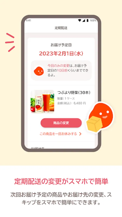 定期お届けコースの次回お届け日、お届け先、商品変更などが簡単にできます。