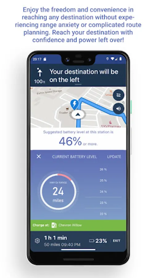 - Tap destinations and charging stations icons to check estimated arrival SOC values at the destinations and charging stations, and also minimum suggested target SOC to charge at the charging stations