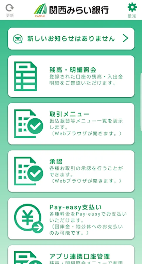 * An application for "Kansai Mirai Business Direct" is required to use this app. Please refer to the Kansai Mirai Bank website for other functions and usage conditions of this application.