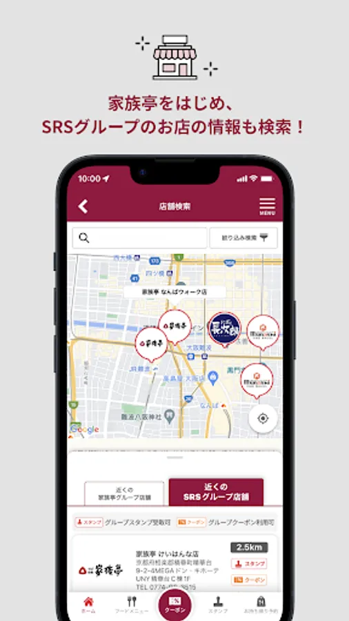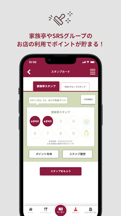 You can receive stamps at Kazokutei group restaurants and SRS group restaurants (Washoku Sato, Chojiro, Miyamoto Munashi, Tendon, Tempura Honpo Santen).