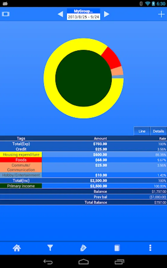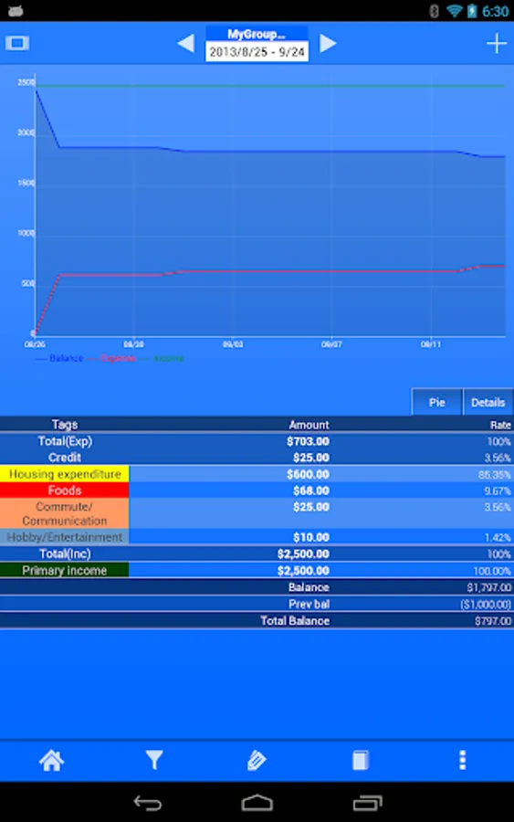 Spendroid also offers many useful tools to visually analyze your spending habits including filters, filter-sets, charts and group aggregation features.