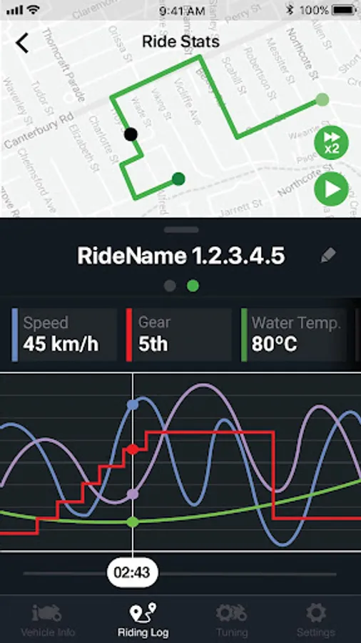 Detailed riding logs including GPS information and vehicle running information can be recorded. While riding, the app tracks vehicle speed, rpm, gear position, throttle position, front brake fluid pressure, acceleration/deceleration, current mileage, coolant temperature, and boost pressure* and temperature* (*on supercharged engine models) from moment to moment. Once the riding log has been saved, you can review these items in a graphic-style display at any point along the route. The app can also display a ride summary, with information that may include: route travelled, total distance, total time, gas mileage (best/average), speed (best/average), max lean angle (right/left), etc. For the graphic-style display mode, you can select which items are displayed, and for either display mode, you can arrange them in the order you prefer.