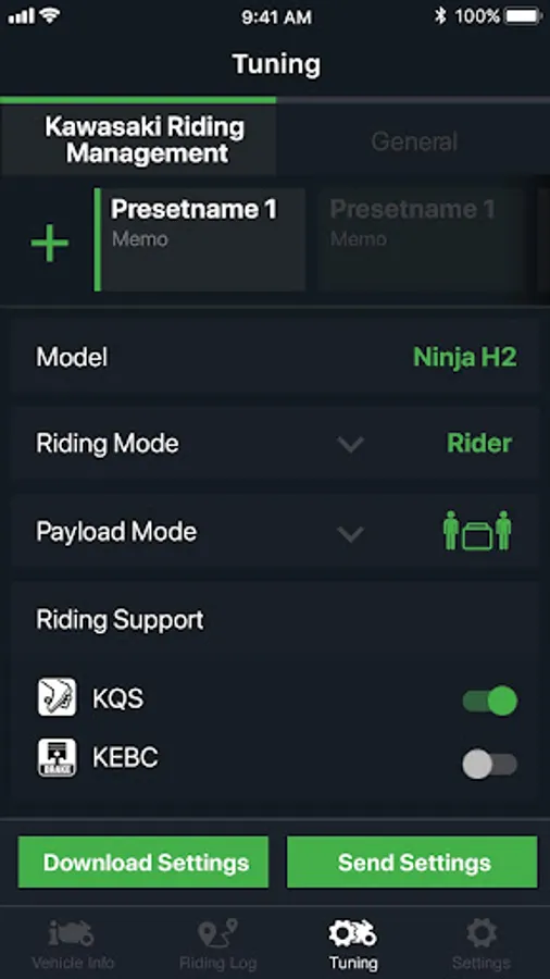 ・When riding (with the app ON), your bike and smartphone are always connected. When the engine is turned off, the latest vehicle information and settings are stored by the app and may be viewed on your smartphone. Any Kawasaki Riding Management changes made via the app while the engine is off, or while out of range, cannot be uploaded until the ignition is turned on and your smartphone is in range with the app ON. General settings can only be updated via the app when the bike and smartphone are connected.