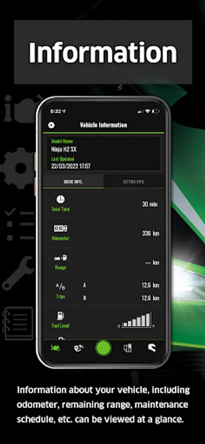 This function enables check on motorcycle information in regards to odometer, remaining distance, maintenance schedule etc.