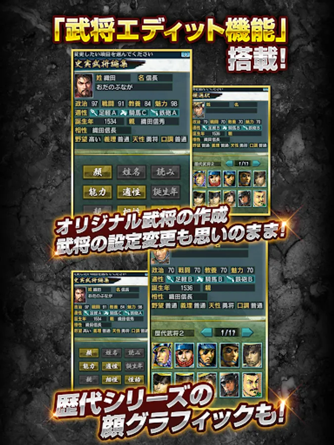 CG images of historically famous military commanders are also included, so enjoy changing into famous military commanders from the historical "Nobunaga's Ambition" series!