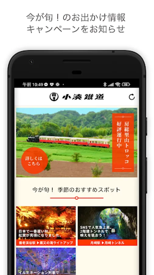 Why don't you feel the four seasons of Satoyama with your skin on the Kominato Railway's special train "Boso Satoyama Torokko"? In addition to making reservations, checking fares and operating dates, you can also see the highlights of the trolley and recommended itineraries.