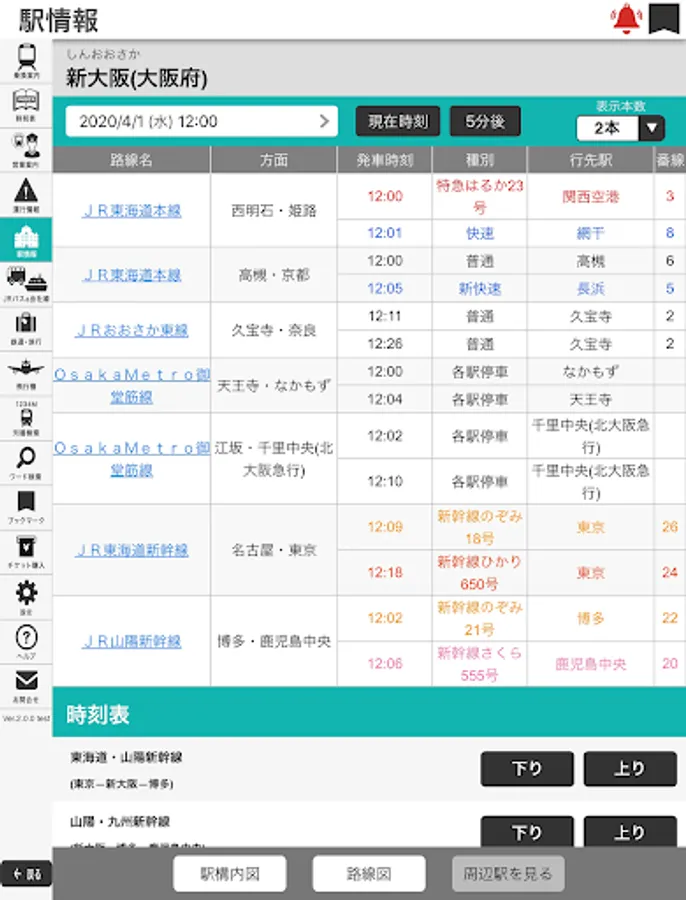 [Departure train information] Displays the time of the latest 2 to 5 trains departing from each station for each route and direction.