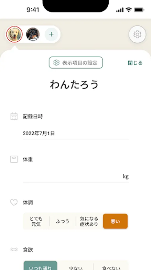 ・ Record today's condition: "Weight", "Appetite", "Water intake", "Poop condition", "Peeing condition", record the condition of each part of the body, and also save photos of memories with your dog can. You can also select and display the items you want to record.