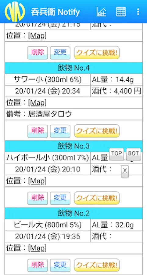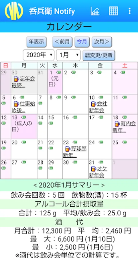 飲物の登録では、ショットごとに代金を支払う場合に便利なように飲物単位の酒代の登録が行えます。飲み会で最後に清算の場合は、最後に注文した飲物情報にあとでその酒代を登録できます。1次会や2次会など、清算するたびに登録しておけば、その日の飲み会の合計金額がいくらであったかが飲み会一覧で見ることができます。カレンダーでは、月単位でのサマリーが表示され、月の酒代の合計や飲み会の回数などが表示されます。