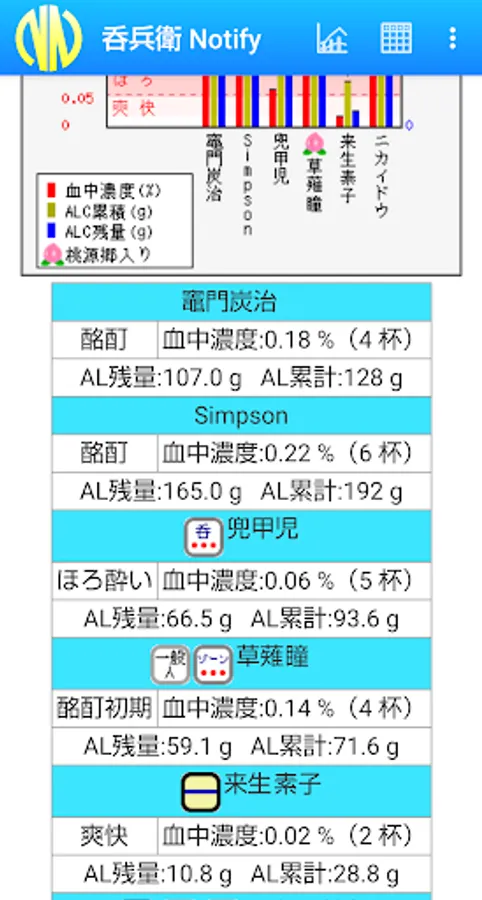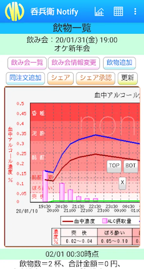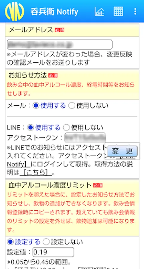 血中アルコール濃度が同じ値であっても、人によってアルコールへの体質の違いがあったり、飲む時の体調により酔い方が違うこともあります。そういった場合や、アルコール分解のサプリを飲んだときなどには、会員情報や飲み会情報を登録する際の「アルコール体質」を変えることで、疑似的に濃度を変えてお知らせ等に適用することができます。