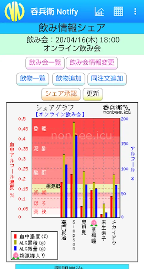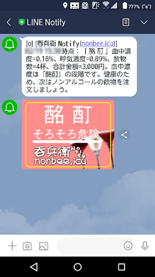 呑兵衛 Notify(のんべえノーティファイ)は、摂取するお酒を飲物ごとに登録していくことで、血中アルコール濃度がどの段階にあるかを「グラフ」や「お知らせ」で分かるようになっています。オンライン飲み会用に飲み情報のシェアもできます。血中アルコール濃度は、飲まれる方の体重や時間の経過で濃度が変わってきます。その濃度により「ほろ酔い」や「酩酊初期」、「酩酊」などの段階があり、その段階が上がるたびにあらかじめ設定したお知らせの方法(メール、LINE)で段階のお知らせをお送りします。