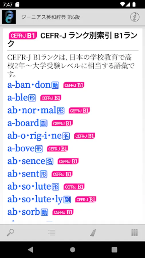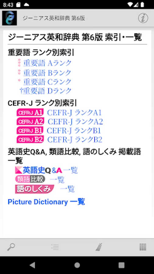 ・There is also an index that summarizes important words by rank from A to D, an index by rank of "CEFR-J (rank A1 to B2)" that is not found in books, a Q&A on English history, a comparison of synonyms, a column on the structure of words and interpretations. It is organized in a list and you can display the column you want to see.