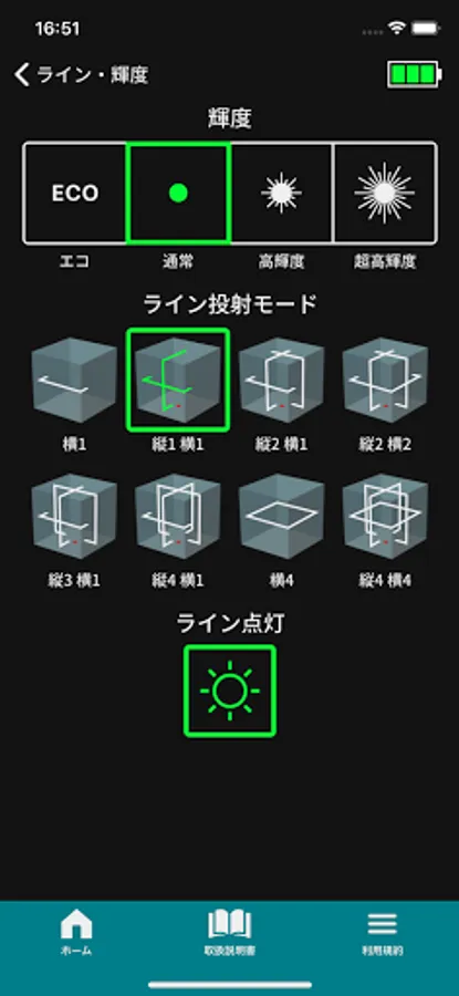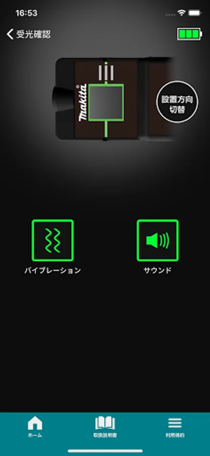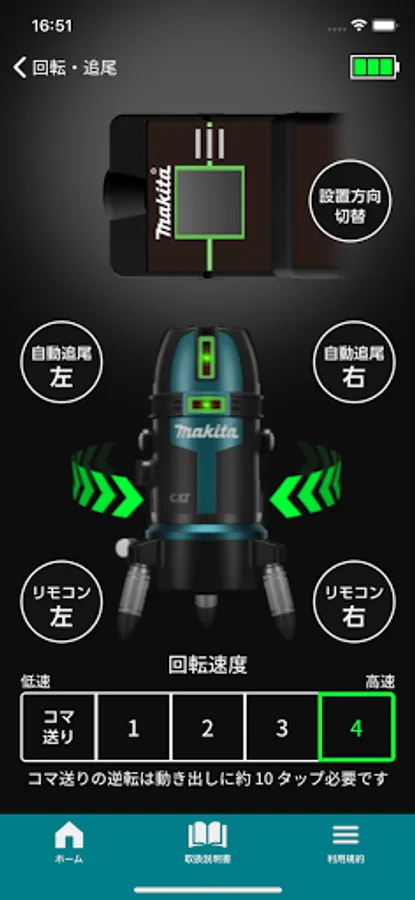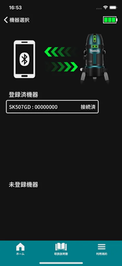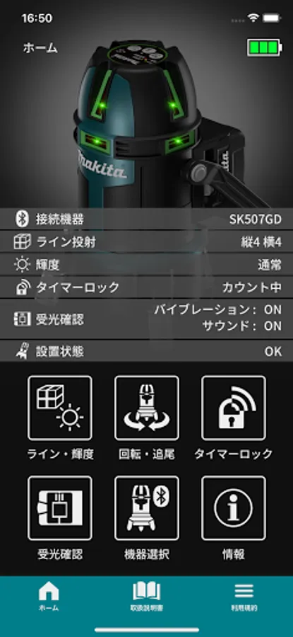 ◆ The Makita laser marking device app (makitalaser) is an application that allows you to perform remote control operations such as line switching, tracking operation, and turning off the line of the target laser marking device. It can be operated without touching the marking device or receiver, and the marking work by one person can be performed accurately and efficiently.