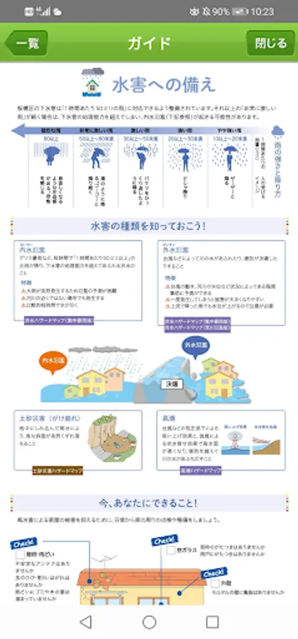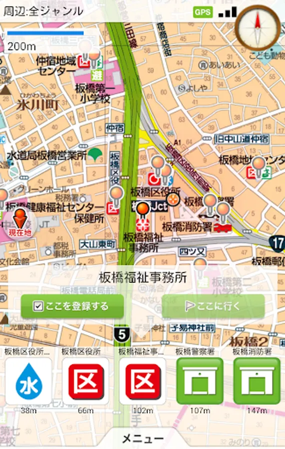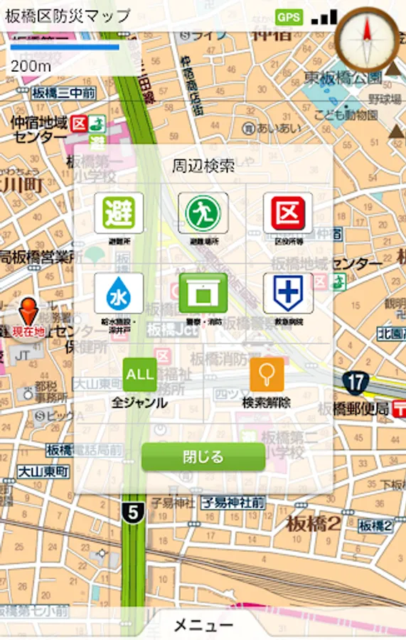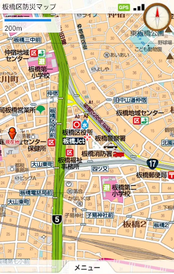 Since the "Itabashi Ward Disaster Prevention Map" is saved on the terminal, you can browse the map even when there is no internet communication environment, and you can use the GPS function of the terminal to display your current location on the map (current location display), and the area around your current location. By searching for information such as evacuation shelters and evacuation areas (peripheral search function) and registering destinations in advance, it is possible to display the straight line (guidelines) connecting the current location and the destination and the direction of the destination. Is possible.