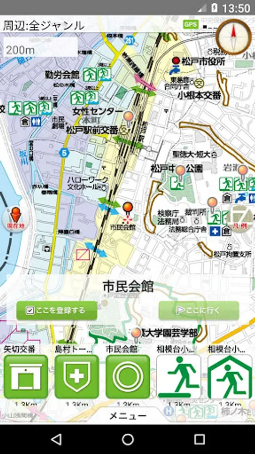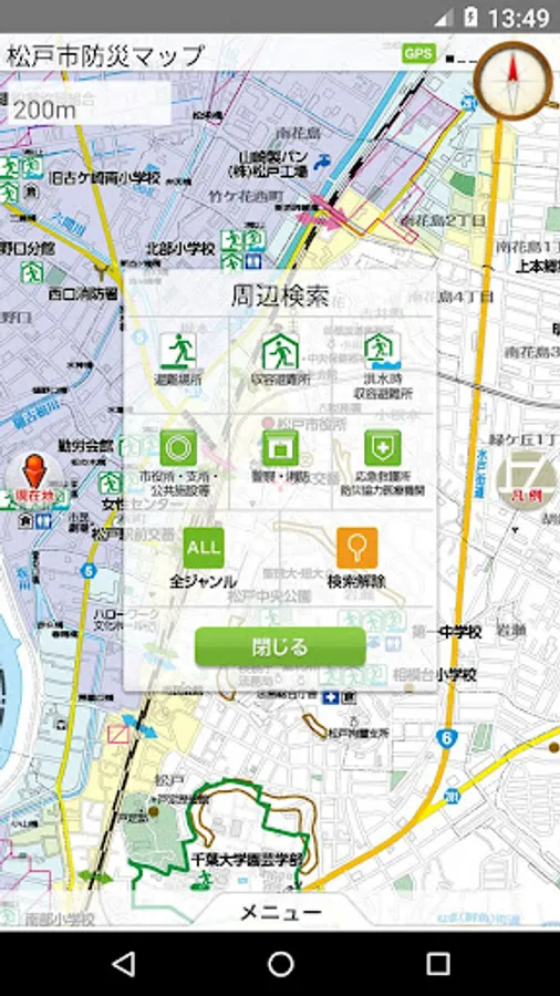 松戸市内の市指定避難場所など、市民の皆様が避難する場所や防災施設の所在地を表示した地図をAndroid端末で確認することができます。防災マップは端末に保存されますので、インターネット通信環境のない状況でも地図を閲覧できるほか、端末のGPS機能を利用し、現在地を防災マップ上に表示させることができます。周辺検索機能を使えば、現在地周辺の避難場所や収容避難所等の情報を検索することもできます。また、あらかじめ目的地を登録しておくことで、現在地と目的地を結ぶ直線(ガイドライン)や目的地の方向を表示できます。