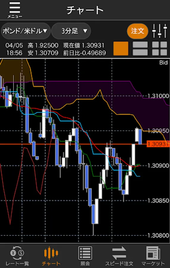 You can browse charts for each currency pair. It is possible to analyze with technical indicators such as moving averages, Bollinger bands, and Ichimoku Kinko Hyo. Zoom in by turning your device sideways.