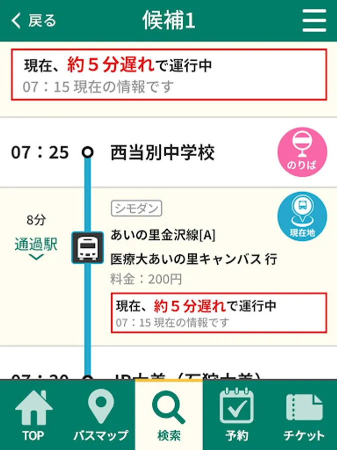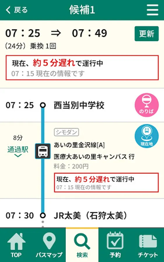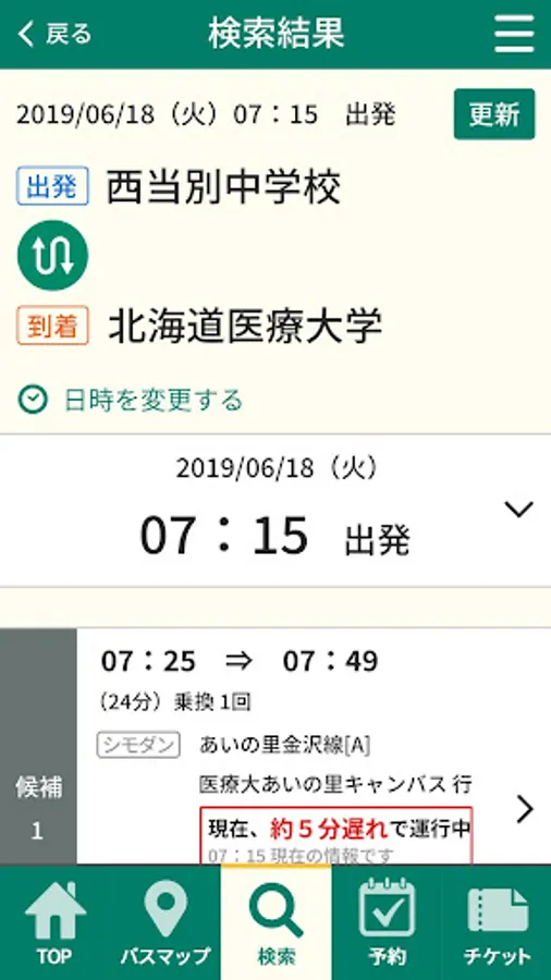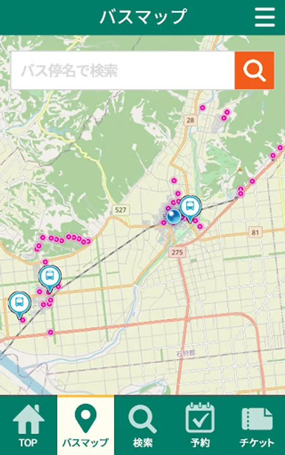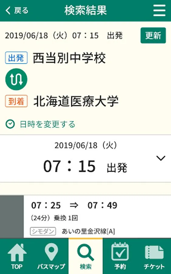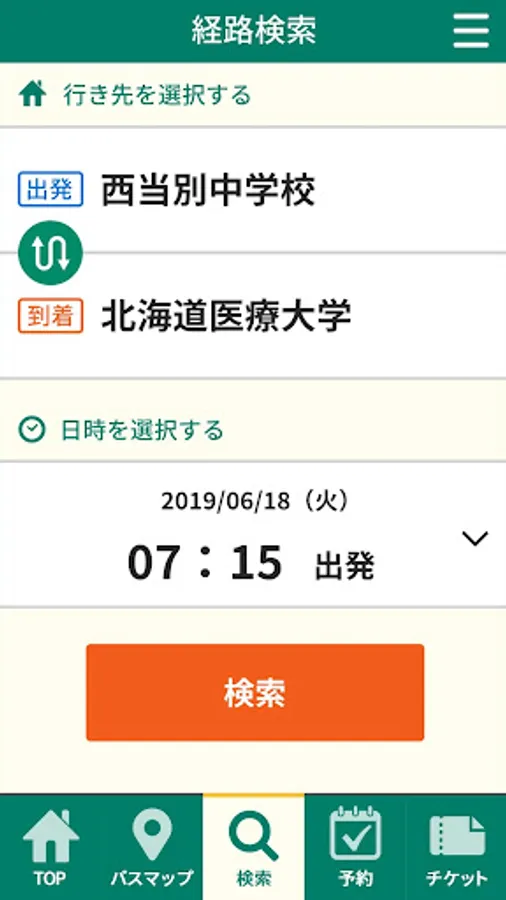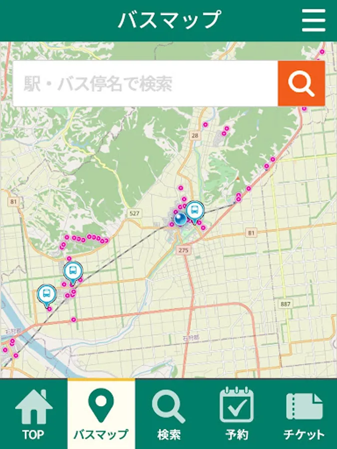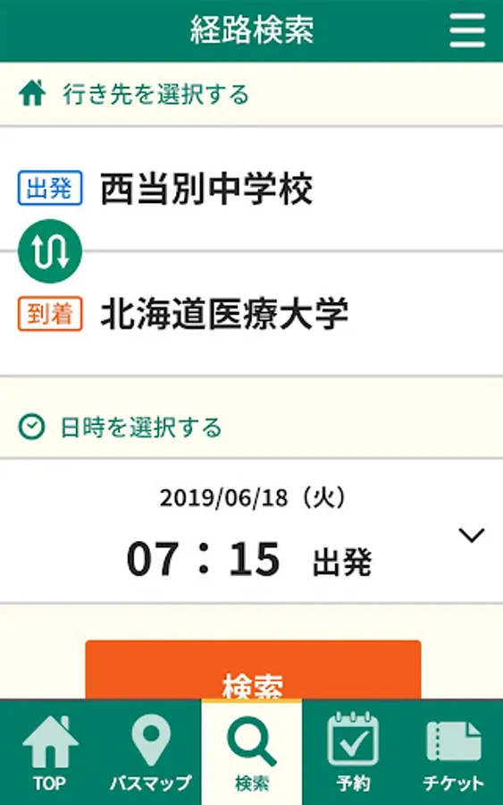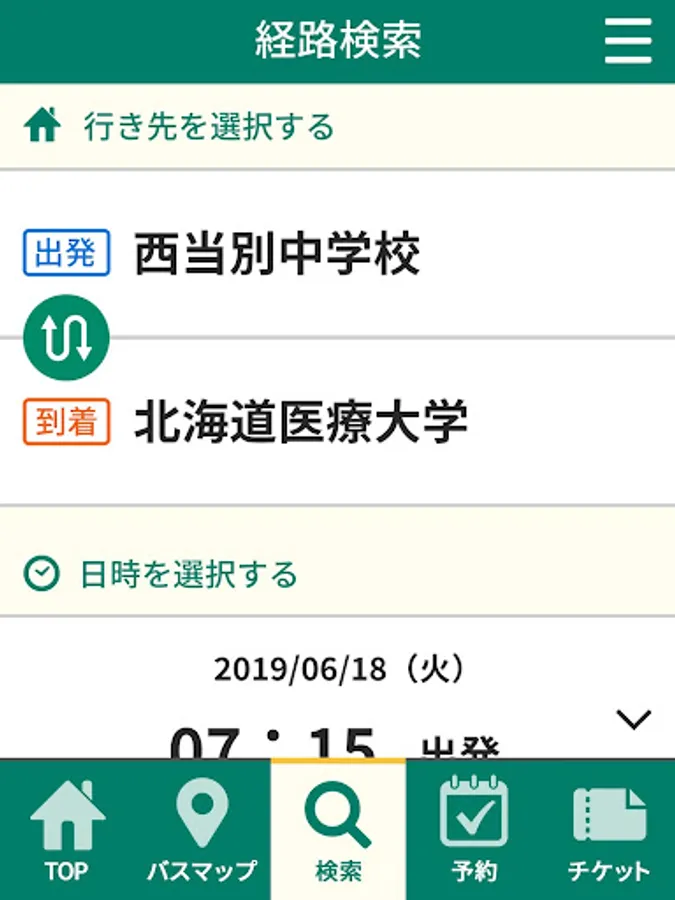 ▶ From the route search page, you can find the nearest bus stop or JR station in Tobetsu town to find out the operating time and transit information.