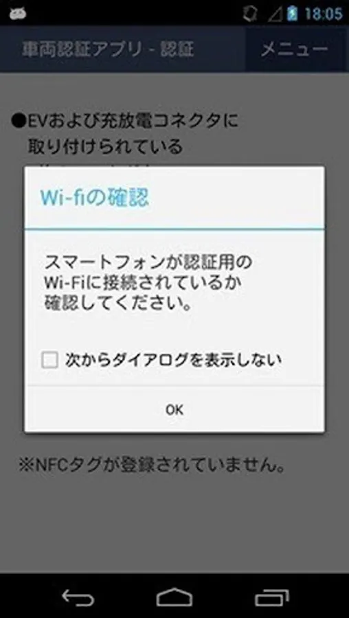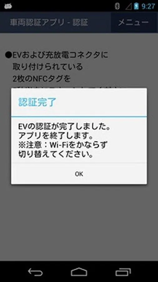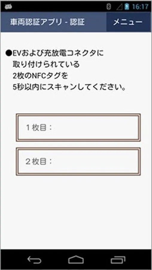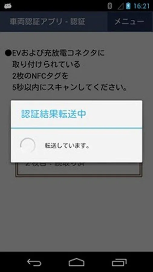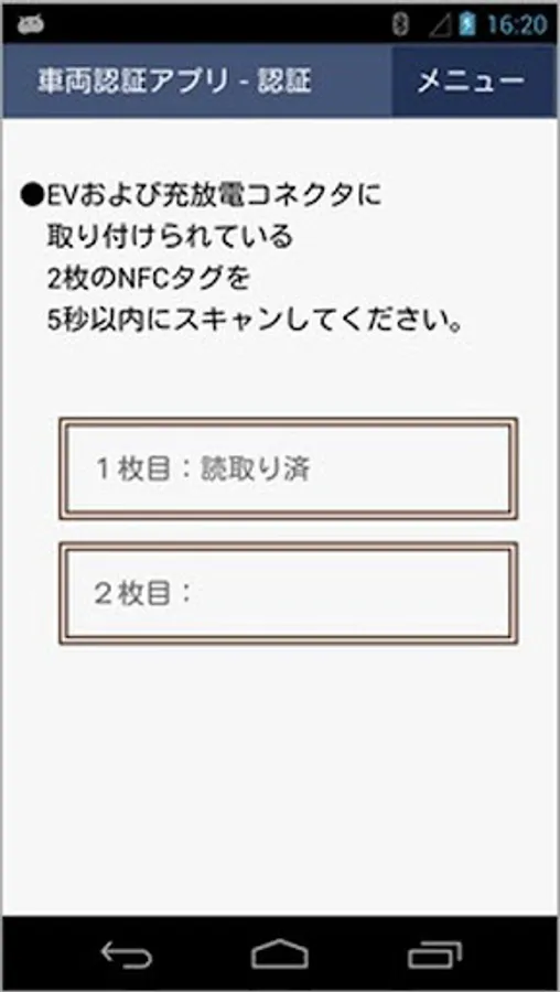 EV用パワーコンディショナの充放電コネクタと電気自動車(EV)に貼り付けられたNFCタグを利用して、車両認証を行うアプリです。スマートフォンより、認証結果をEV用パワーコンディショナに送信することによりEV用パワーコンディショナの放電ロックを解除します。