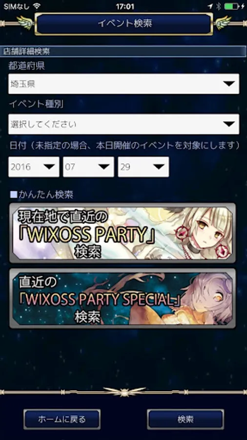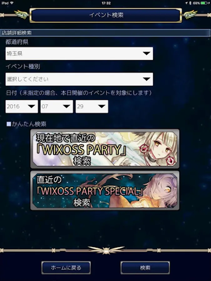 Easy Search · WIXOSS events such as PARTY in the date, time, and location.