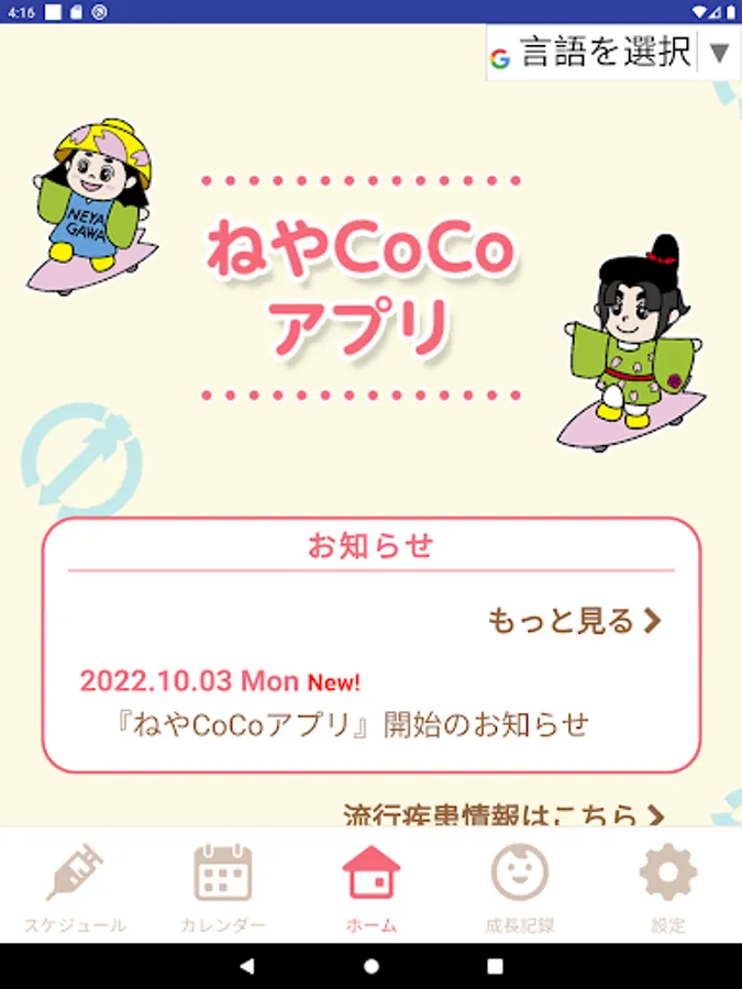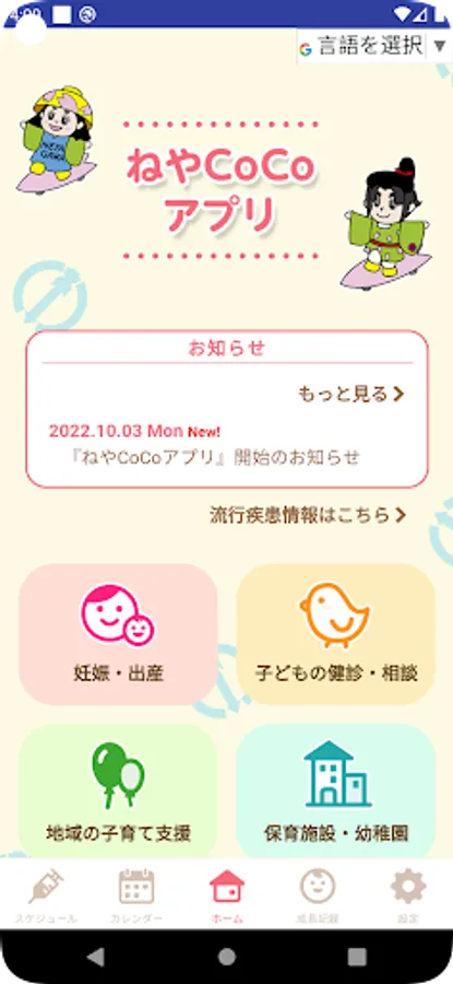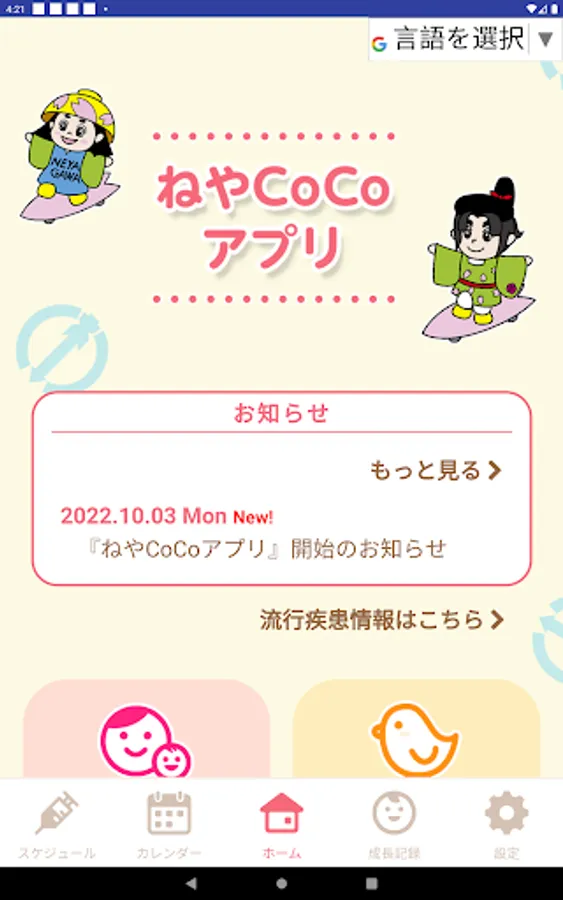 The "Neya CoCo App" has a lot of information about Neyagawa City's child (Co) raising support, and allows the whole family to enjoy child (Co) raising, such as inputting child's growth records and vaccination schedules. It is an app that can