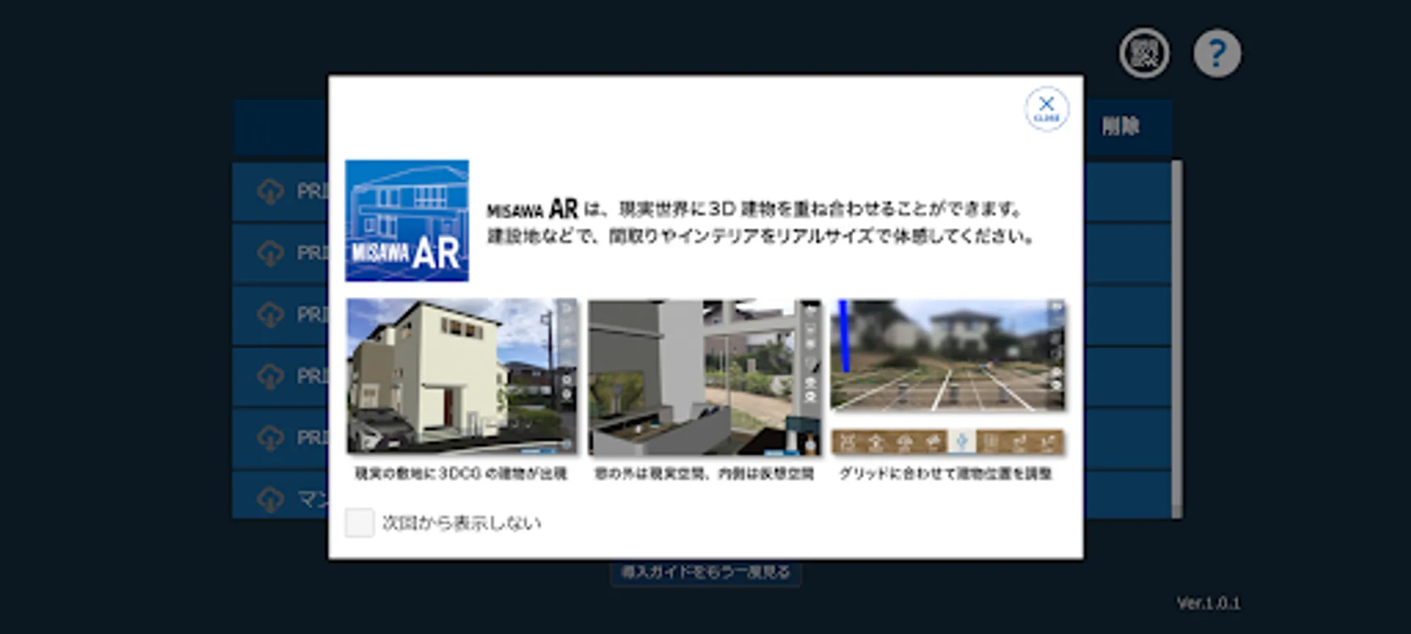 "MISAWA AR" is an application that allows you to experience the home of Misawa Homes in AR. The 3DCG that appears in AR not only allows you to accurately display the exterior of the building, but also allows you to move around in the room and see the outside view from the window.
