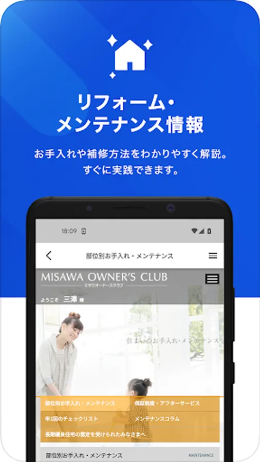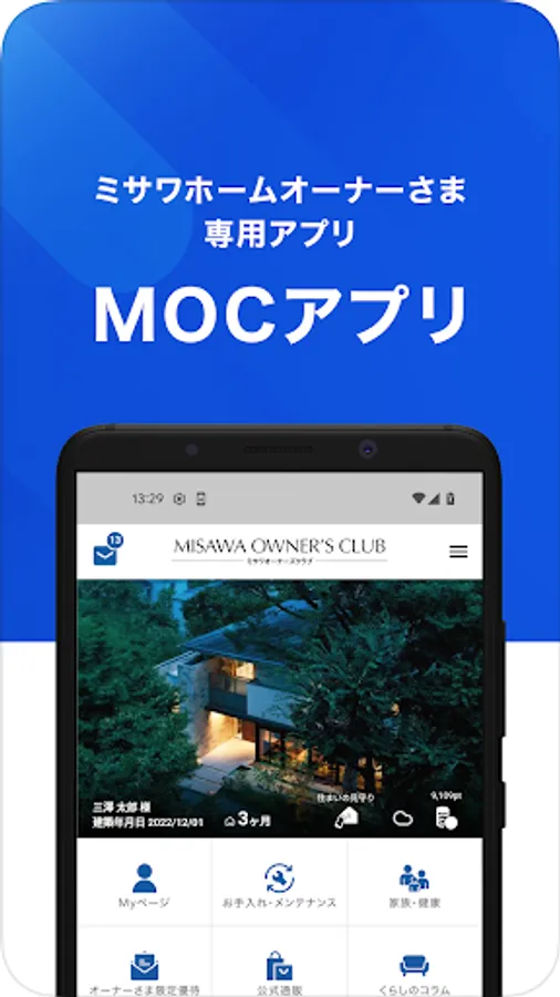 App for exclusive use of Misawa home owners. We provide information on maintenance and renovation of your home, as well as useful information tailored to individual owners, such as special offers, disaster prevention and weather information.