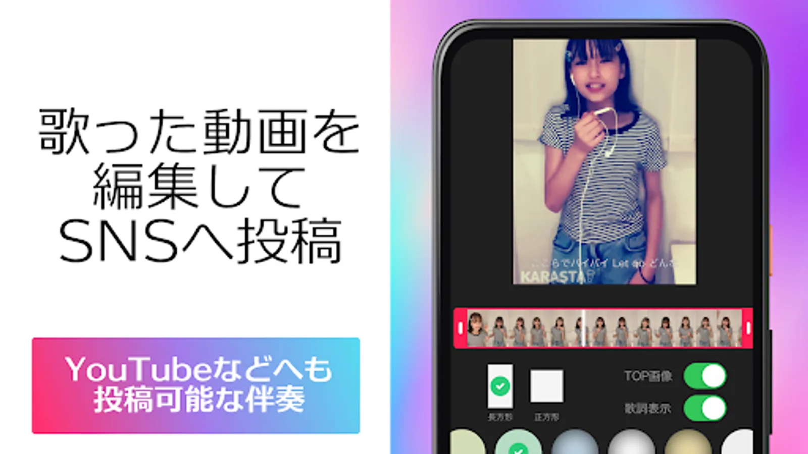 If you record a video of yourself singing with KARASTA, you can immediately post it to YouTube or TikTok. The song title and lyrics are automatically displayed in the video, and you can upload it immediately without editing!