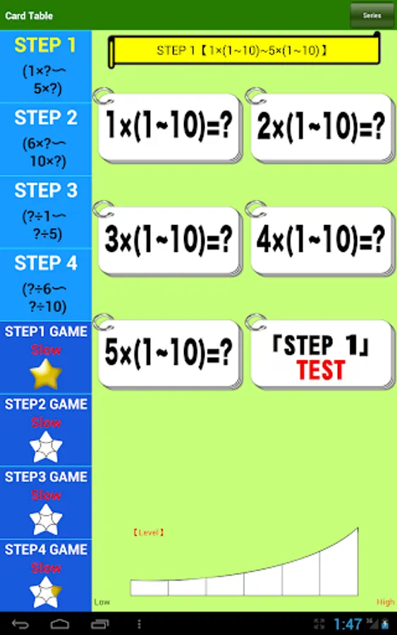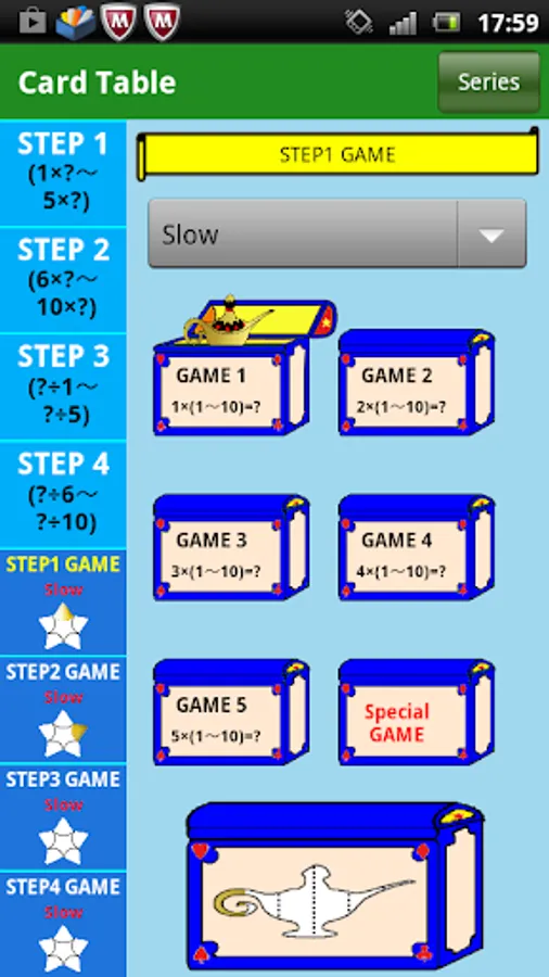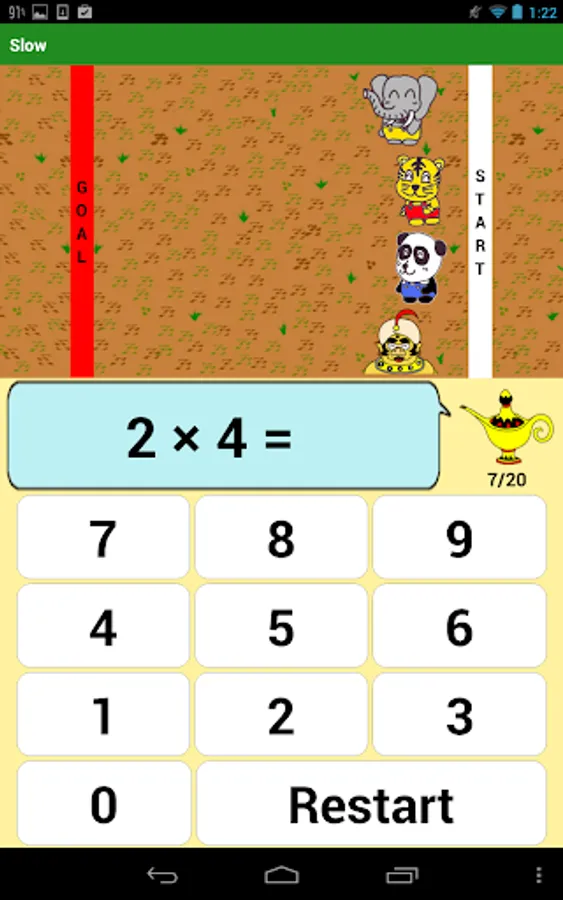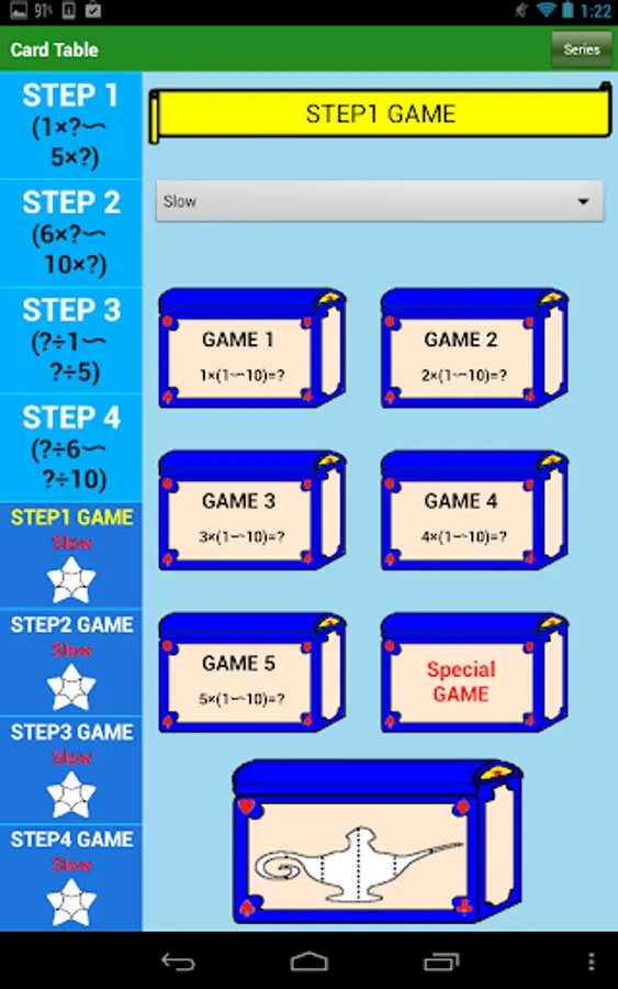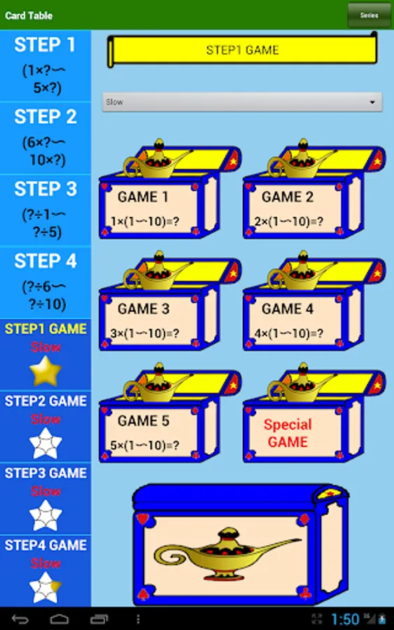 The game learning is a mission game that you rescue a genie of the lamp. You will get various things and see something surprising in the process until you accomplish the mission. You can enjoy learning multiplication and division through the game. Studying steadily with flash card exercises is the key point to do so well in the game learning.