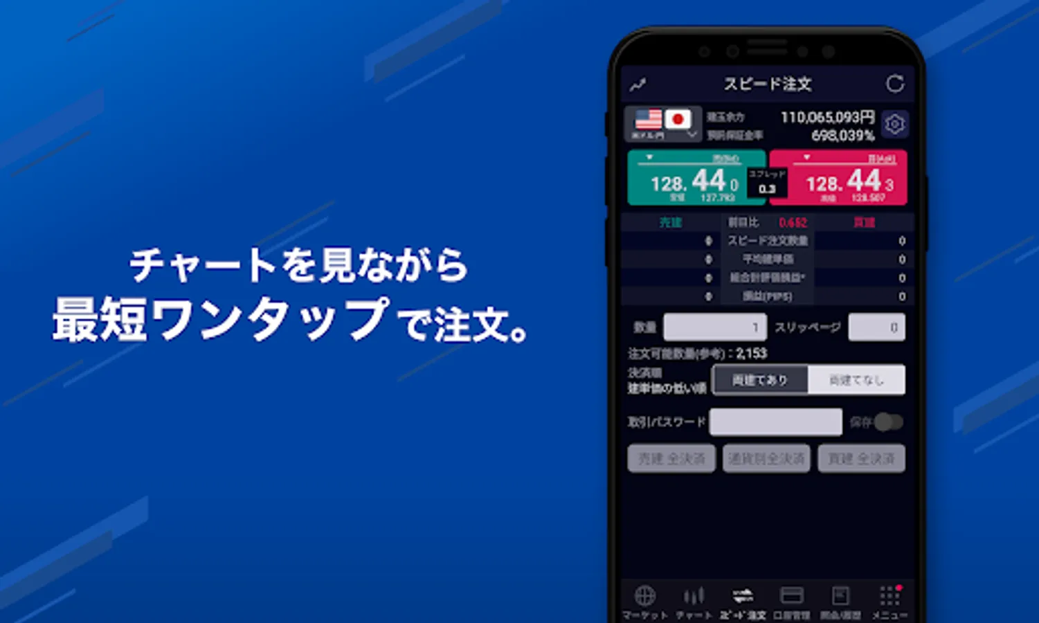 - Equipped with a high-speed order function that allows you to make new/settlement, doten/all settlement orders with one tap. With the speed-oriented order function, you can quickly respond to changes in the market price, so you will not miss a trading opportunity.