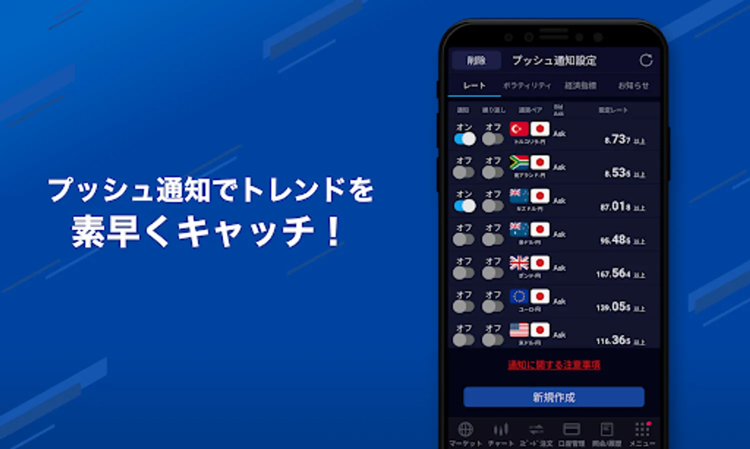 - Equipped with 14 kinds of technical indicators. Unique analysis functions such as a trend line drawing function, a chart function that displays two currency pairs at the same time, and a chart that draws multiple technicals at the same time are also available. Full-fledged chart analysis comparable to PC can be performed with the smartphone app.