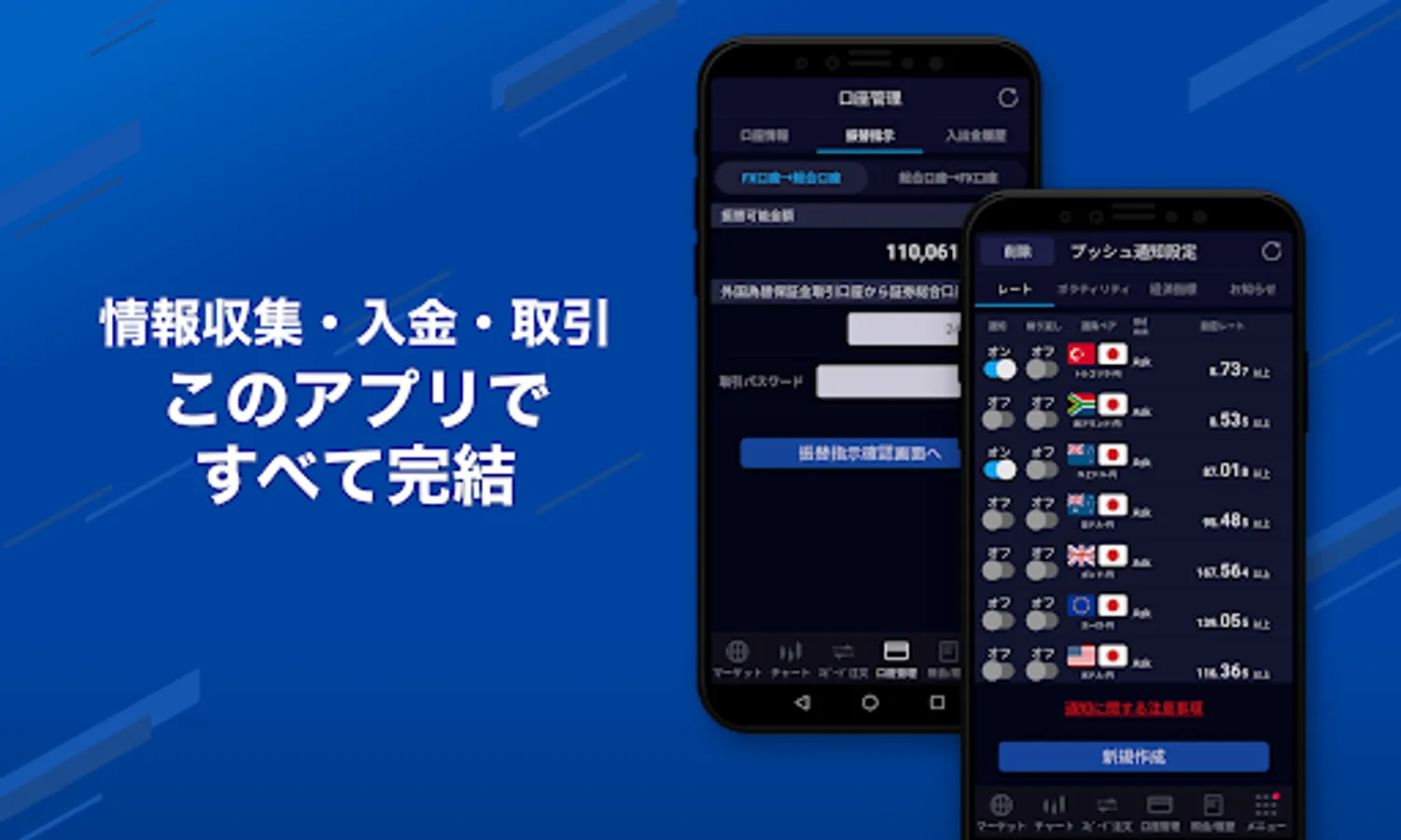 In addition to being able to make new/settlement orders, do-ten/all-settlement orders with one tap, advanced chart analysis comparable to that of a PC is also possible. You can complete everything from information gathering to deposit and withdrawal functions with this app.