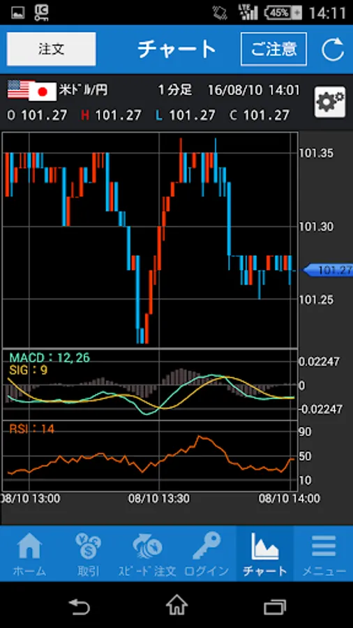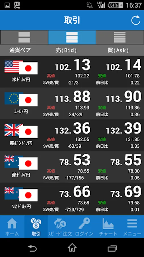 ・レート更新間隔を最短1秒に設定可能、また、主要な取引画面への遷移時は最新レートを表示。