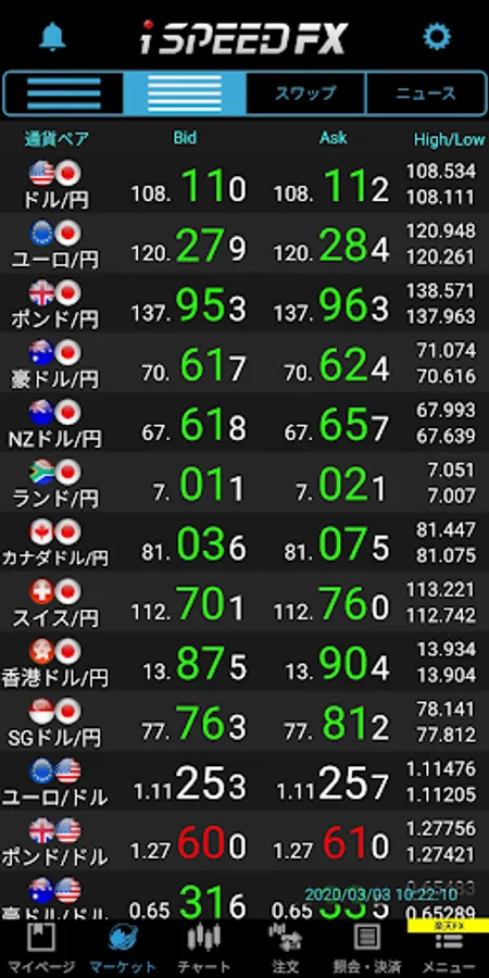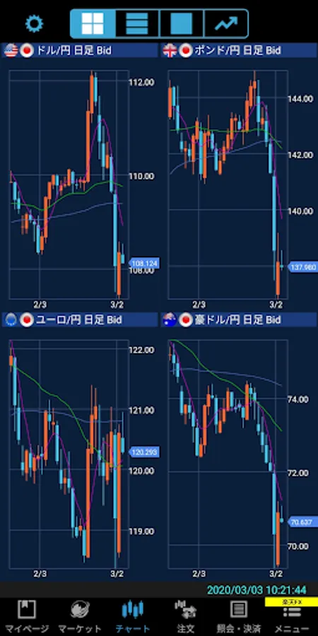 By displaying 4 charts simultaneously, you can compare price movements and grasp market trends. By parameting the settings of technical indicators you can display high-performance charts on par with PC-like quality charts.