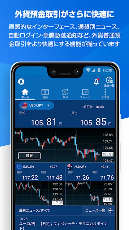 直感的なインターフェース、通貨別ニュース、自動ログイン・急騰急落通知など、外貨普通預金取引をより快適にする機能が揃っています。また、外貨預金口座をお持ちでないかたも、このアプリで外貨口座開設いただけます。