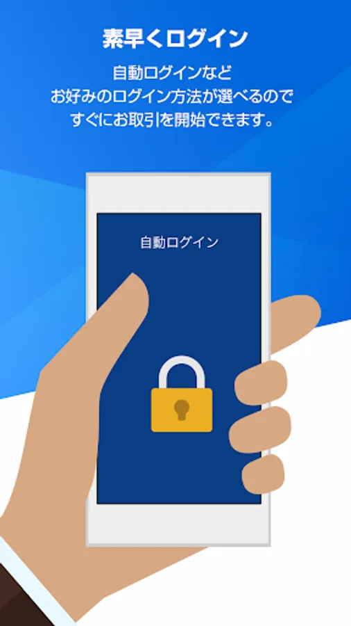 買いたいときや売りたいときにすぐ取引できるよう、ログインには生体認証<iOSのみ記載>・自動ログイン・PIN認証が利用できます。WEB取引パスワードも保存可能なので、売買スピードが飛躍的に向上します。