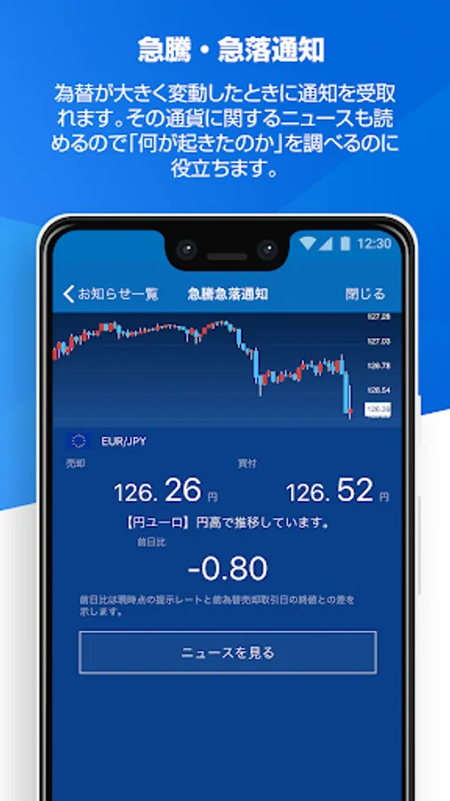 レートが大きく値動きした場合に通知(急騰・急落通知)を受け取ることができます。通貨ペアごとにON/OFFの設定をするだけなので、誰でも簡単にご利用いただけます。その通貨に関するニュースも読めるので、「何が起きたのか」を調べるのに役立ちます。
