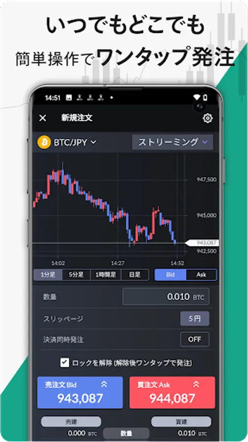 You can easily check the real-time rate and transaction profit and loss on the home screen, and you can also transition to the order screen with one tap, so you will not miss a trading opportunity.