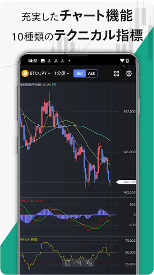 -Display all 10 kinds of technical indicators including popular indicators such as MACD and Ichimoku Kinko Hyo. With the smartphone app, you can perform multifaceted chart analysis according to your own purpose.