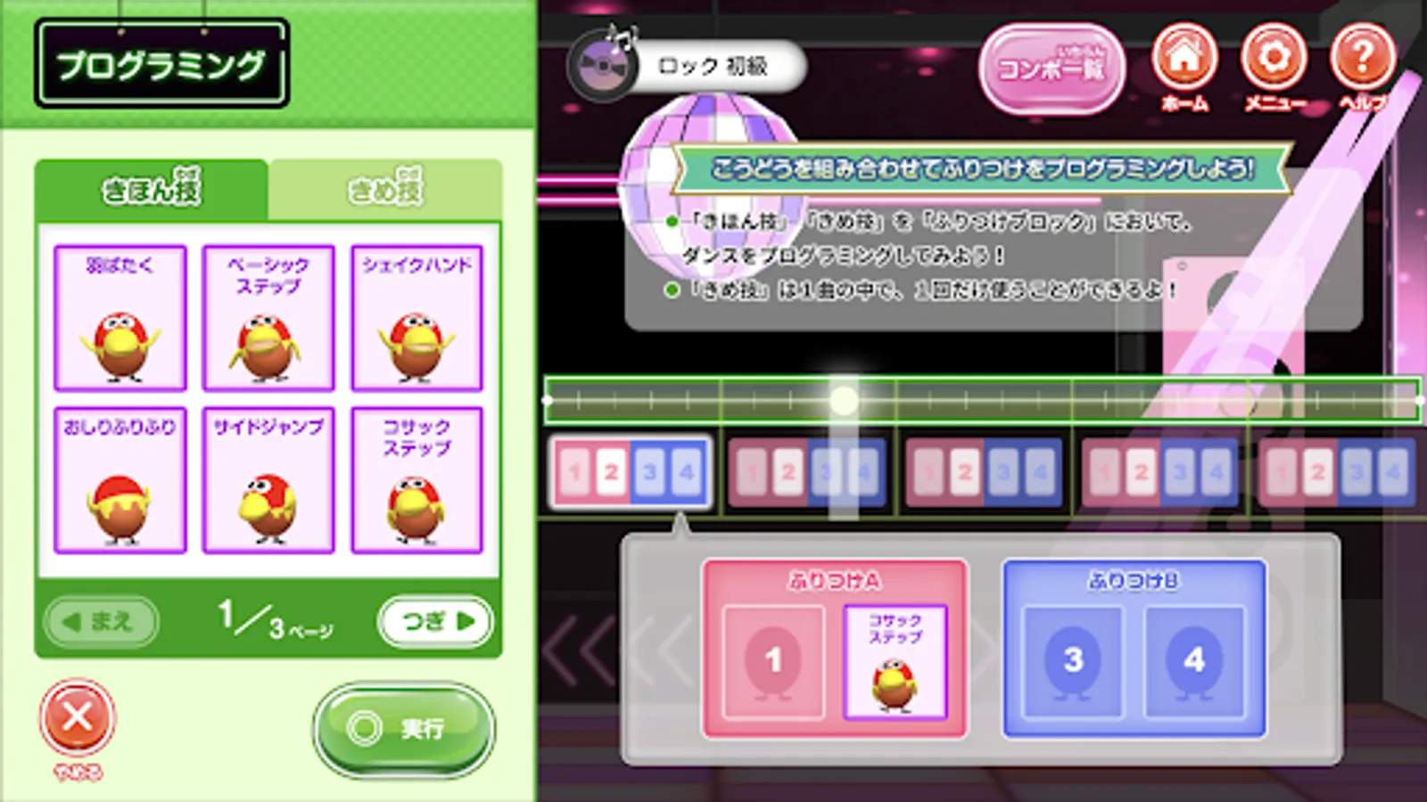 2. Select the stage on which Kyoro will dance. Dance songs can be selected from three genres: rock, pop, and jazz. There are beginner, intermediate, and advanced levels of difficulty.