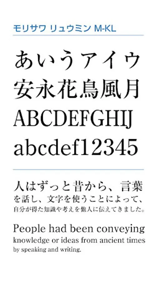 "Ryumin" is a standard Mincho typeface developed based on typefaces. It is an elegant yet friendly Mincho typeface that makes use of the sharpness of a chisel derived from metal type, and has a reputation for its well-proportioned and flowing expression. It is widely used as a basic typeface for DTP.