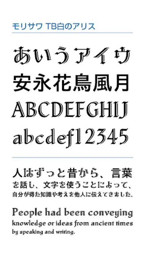"TB White Alice" is a typeface that expresses the image of the European typeface blackletter in kana. By adding decorative decorations to the neat skeleton, we have created a gorgeous look without sacrificing readability. Offered in combination with simple Gothic kanji.