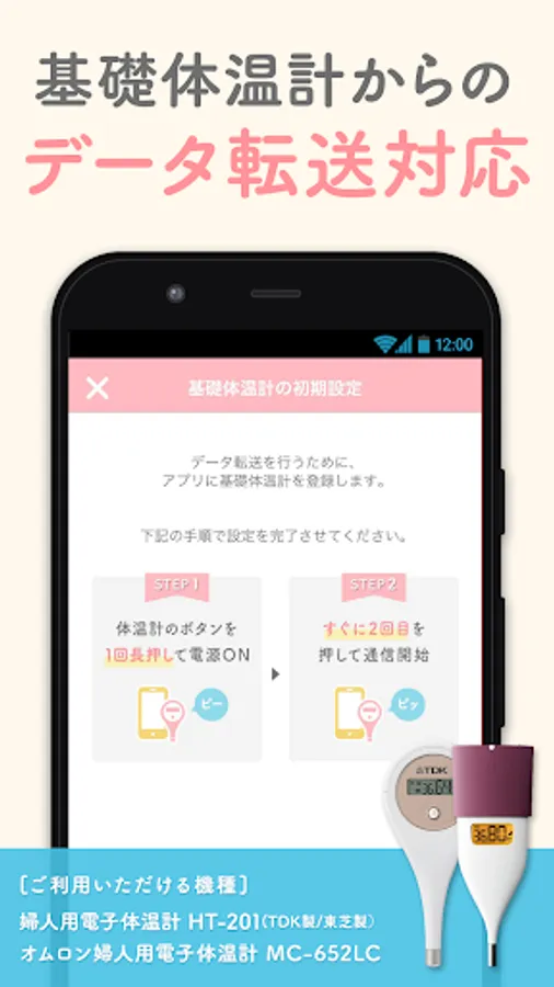 In addition, it supports data transfer from electronic thermometers for women HT-201/HT-301 (manufactured by TDK/Toshiba) and electronic thermometers for women MC-652LC (manufactured by Omron), making it easy to record every morning!