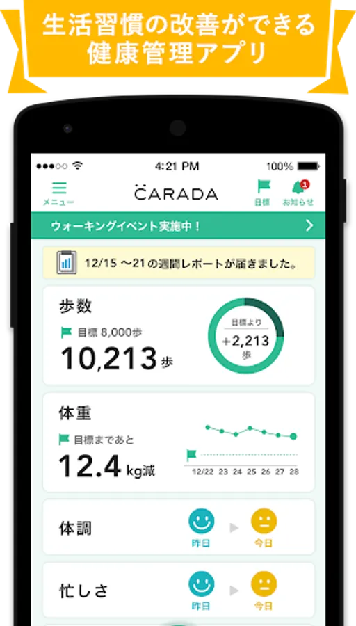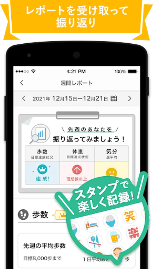 Get a weekly report on your steps, weight, mood, and stamp records. You can check the target achievement status in the report and review the record contents.