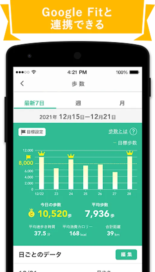 If you install and link with Google Fit, an Android™ health management app, your steps, sleep, and weight data will be automatically reflected in the app.