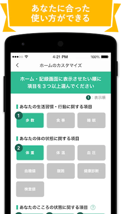 You can freely display frequently used items on the home and recording screens. You can also record daily events with stamps and compare them with other items.
