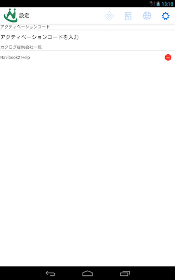 ご利用には、当社提供のNaviBookデジタルカタログ制作サービスをご利用時に発行するアクティベーションコードを設定画面から入力します。
