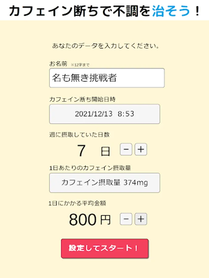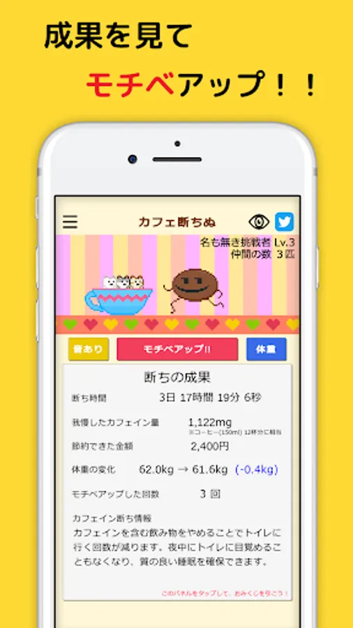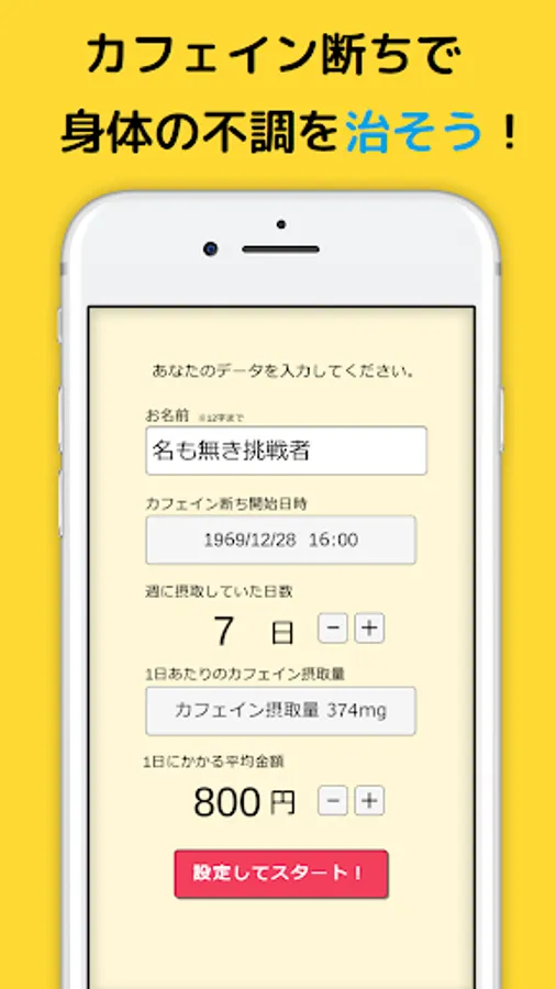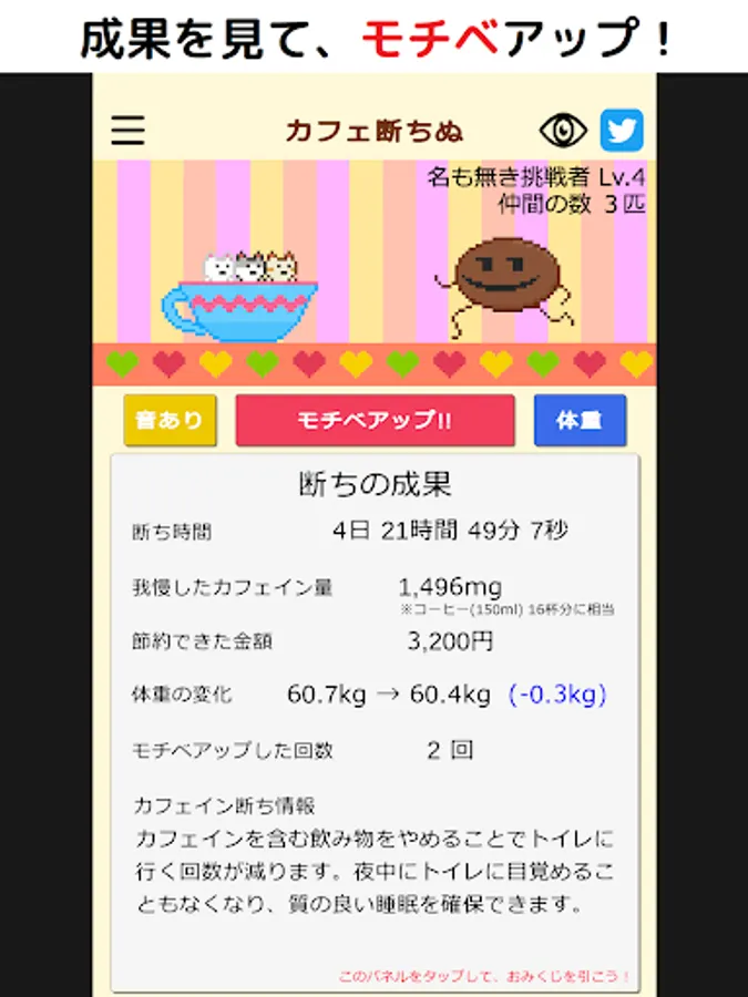 By visualizing the results such as the amount of money saved and the amount of caffeine that can be endured (the coffee conversion is also displayed), it supports the maintenance of motivation to overcome your caffeine dependence.