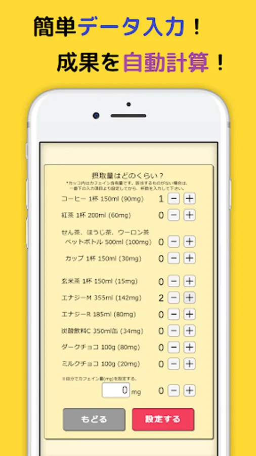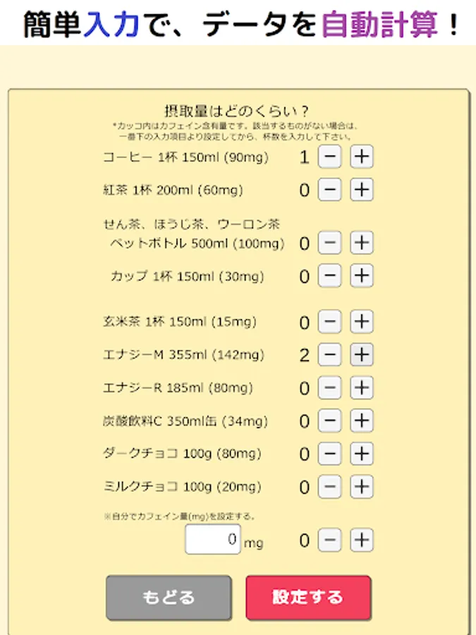 ・Check the amount of caffeine you can endure (converted display by the number of cups of coffee)