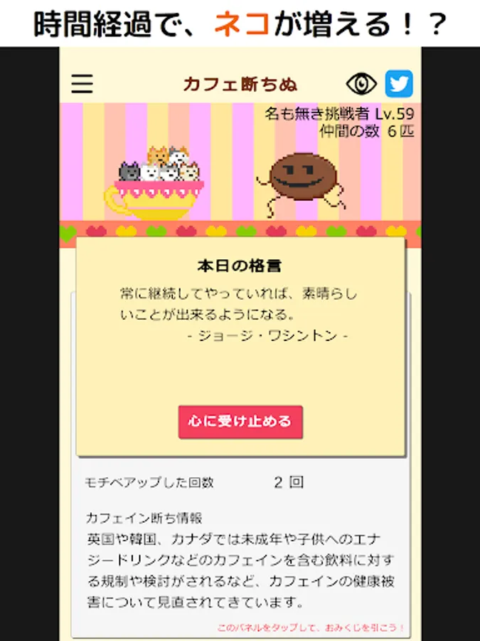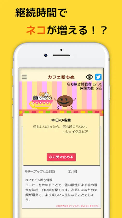 It is a time counter app for cutting caffeine. As time passes, the number of cats on the coffee cup will increase, and you can enjoy caffeine-free habits.
