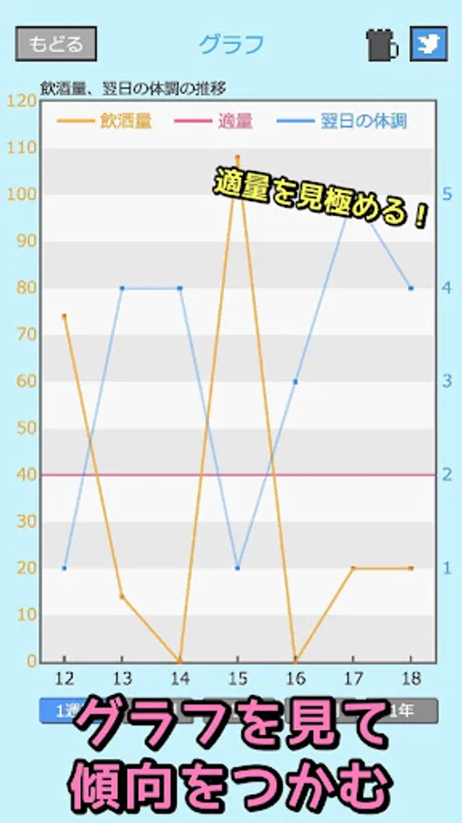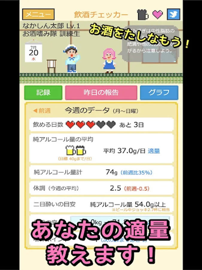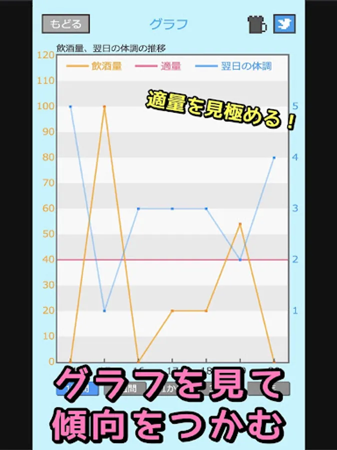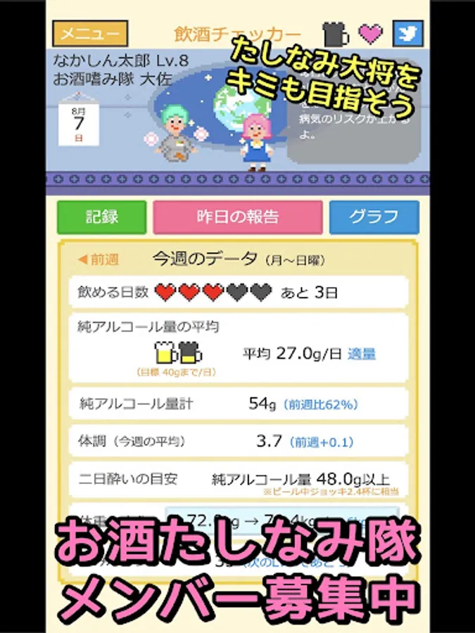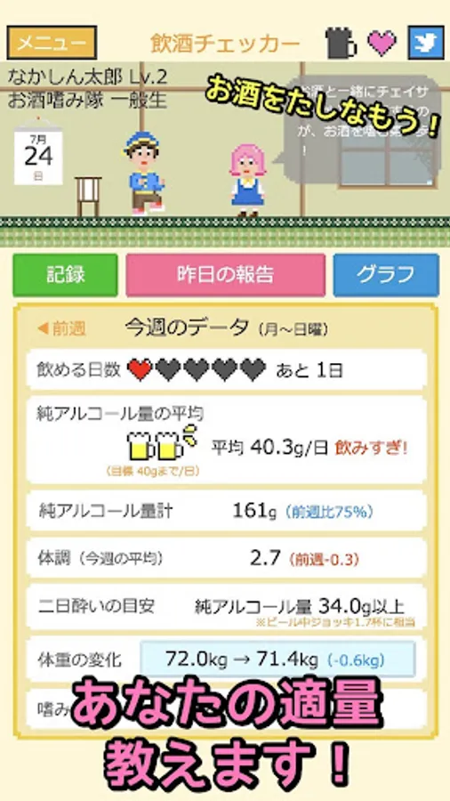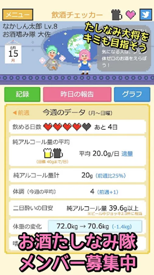 ・Confirm changes in alcohol consumption and physical condition with a line graph